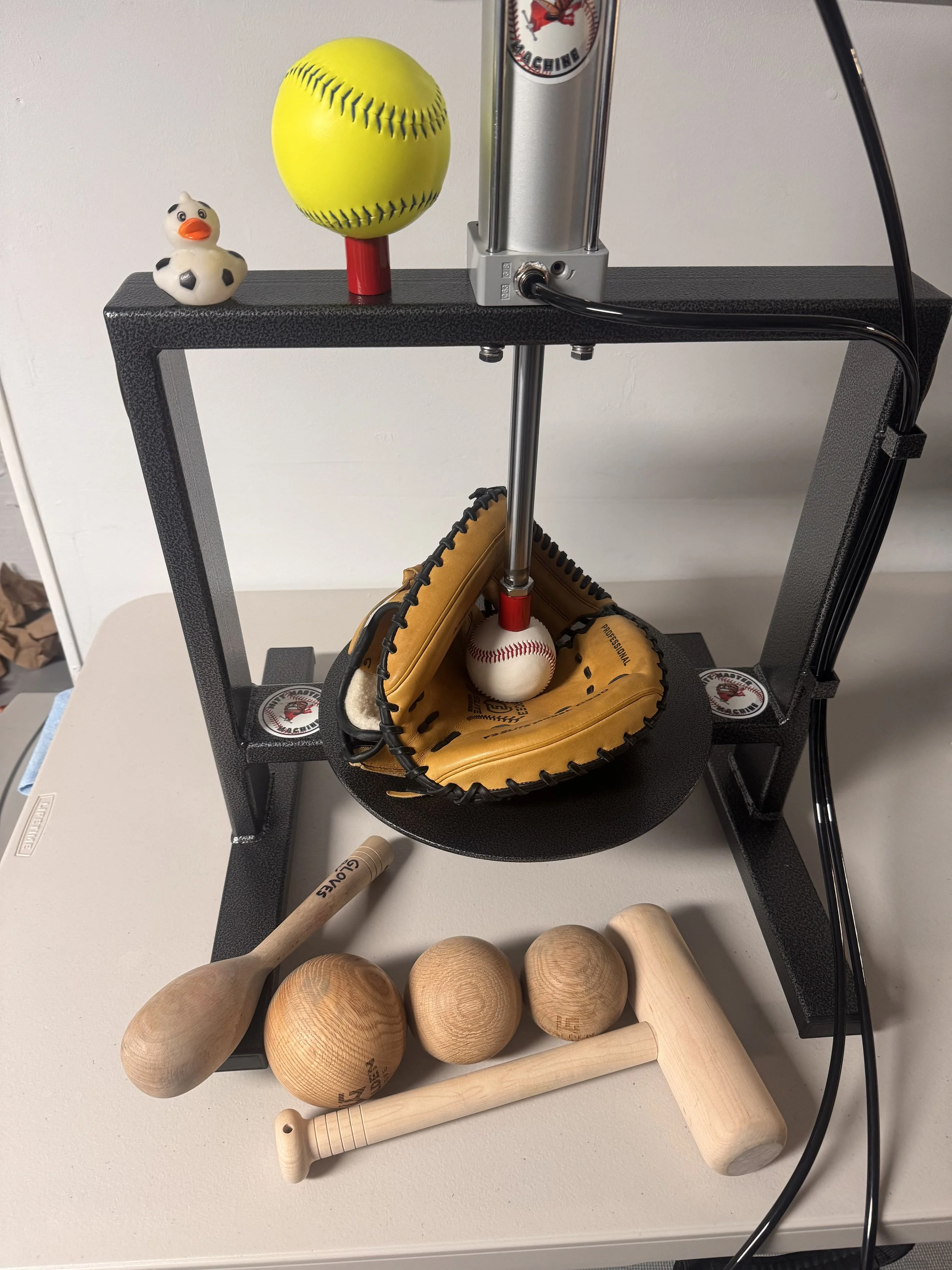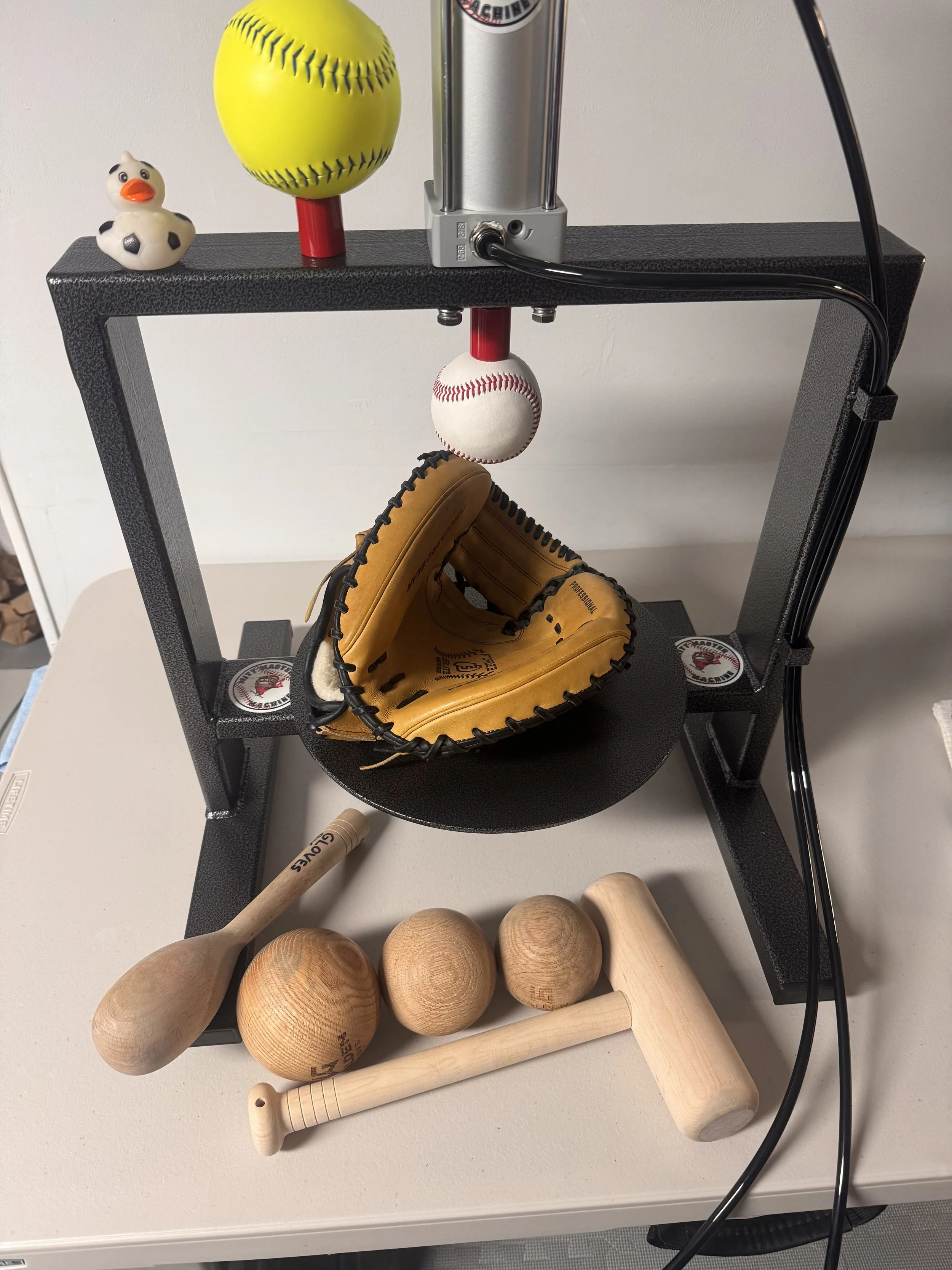 Damp glove is shaped with our Mitt Master Machine, and a mix of mallets and weighted balls